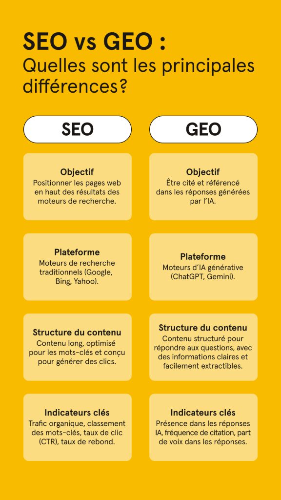 Le SEO et le GEO ne s’opposent pas. Ils se complètent. Le SEO continue de jouer un rôle central dans l’acquisition de trafic organique. Il permet d’être trouvé, comparé et consulté. Le GEO, quant à lui, transforme la manière dont l’information est sélectionnée et intégrée dans les réponses générées par les outils d’intelligence artificielle.